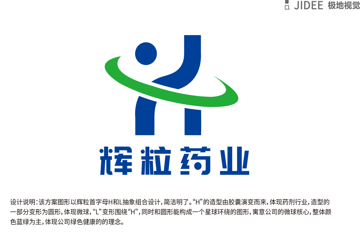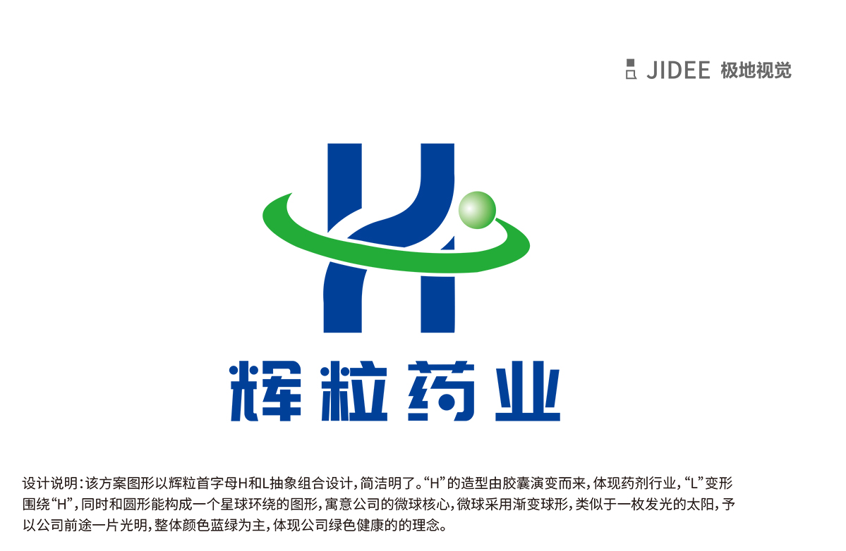 輝粒藥業(yè)logo 設(shè)計(jì)方案以輝粒首字母H和L抽象組合設(shè)計(jì),簡潔名了,H 的造型由膠囊演變而成,體現(xiàn)藥劑行業(yè),造型的的一部分變形為圓形,體現(xiàn)微球,L變形圍繞H,同時(shí)和圓形能構(gòu)成一個(gè)星球環(huán)繞的圖形,寓意公司的微球核心,整體顏色以藍(lán)綠為主,體現(xiàn)公司綠色健康的理念。